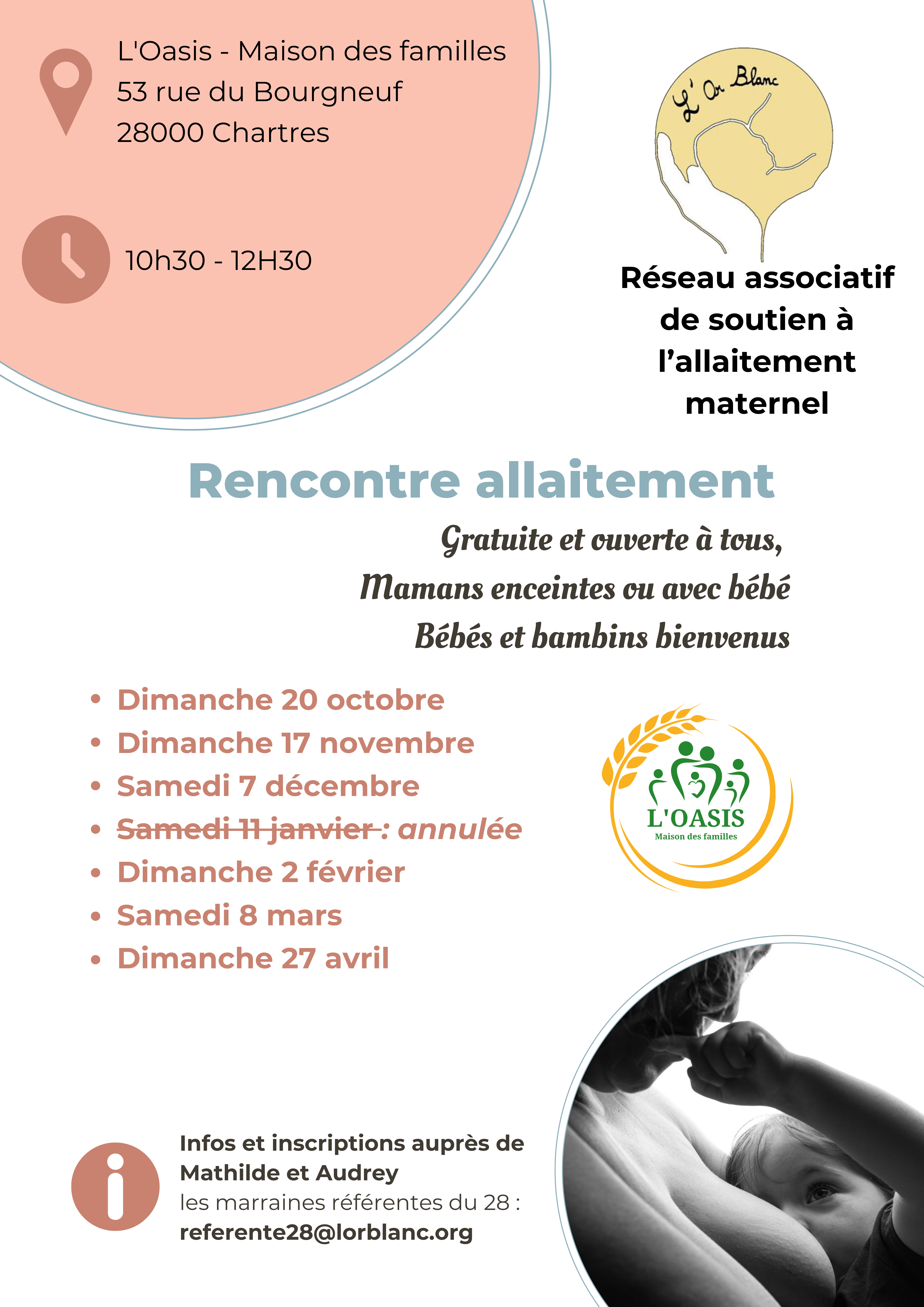 Prochaines Rencontres autour de l’Allaitement en présentiel à Chartres et Mézières en Drouais avec L’Or Blanc à la rentrée !